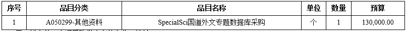 一、采购项目名称:湖南第一师范学院SpecialSci国道外文专题数据库采购。 预算金额:¥ 130,000.00