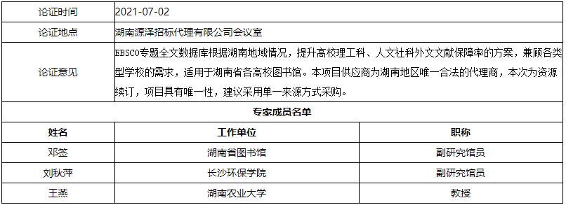 采购人的EBSCO专题全文数据库湖南高校共建共享数据库项拟进行单一来源采购,现将有关事项公告如下: