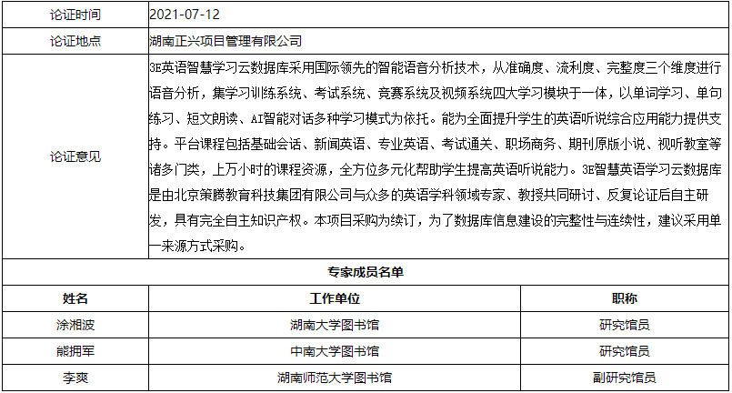 3E智慧英语学习云数据库是由北京策腾教育科技集团有限公司与众多的英语学科领域专家、教授共同研讨、反复论证后自主研发,具有完全自主知识产权。本项目采购为续订,为了数据库信息建设的完整性与连续性,建议采用单一来源方式采购。。