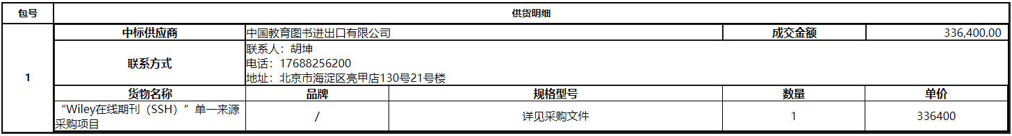 湖南师范大学的湖南师范大学“Wiley在线期刊(SSH)”单一来源采购项目单一来源采购项目于2021年11月11日结束,现将中标(成交)结果公告如下: