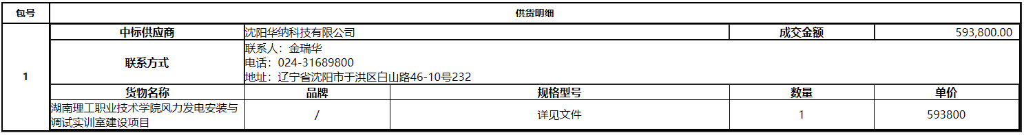 湖南理工职业技术学院的湖南理工职业技术学院风力发电安装与调试实训室建设项目单一来源采购项目于2021年12月03日结束,现将中标(成交)结果公告如下: